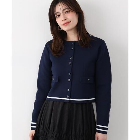 程よい厚みと上品なハリが特徴のミラノリブで編み立てたニットジャケット。きちんと見えしながらも軽く、ストレスのない着心地が魅力です。袖口と裾にはマリンテイストのラインを入れ、シンプルな中にアクセントをプラス。前立ての樹脂×メタルコンビボタンや、フラップポケット風のディテールがクラシックなムードを演出します。短めバランスで、スタイルアップ効果のある一枚です。