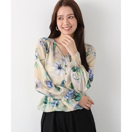 繊細な水彩画タッチのフラワープリントが女性らしさを引き立てるブラウス。柄は南国風のハイビスカスとワイルドローズを組み合わせたボタニカルアートデザインで、華やかさと上品さを兼ね備えています。すっきりとしたVネックラインに、タックとギャザーが柔らかな表情を生み、ウエストゴムで寄せたギャザーが自然なメリハリを添えます。裾はアウト設定でスタイリングに軽やかさをプラス。スカートインしてもきちんと感のある着こなしが可能な位置に配された、一枚で表情豊かなブラウスです。