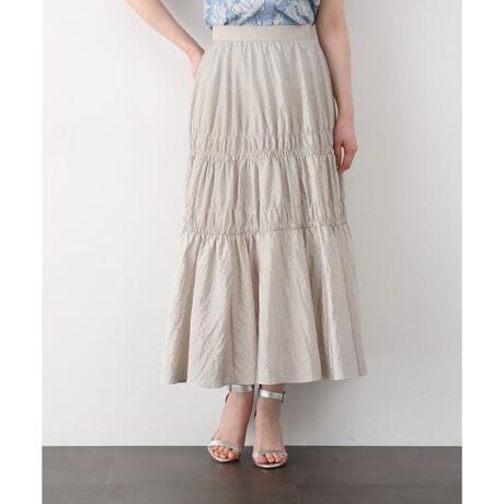 素材の凹凸感や光沢感が印象的なスカート。プリーツのような細やかなギャザーディテールが素材に表情を添え、切り替えで徐々に広がるティアードデザインが腰まわりをすっきりと見せるシルエットを作ります。デイリーはもちろん、お呼ばれシーンにも活躍する一着です。