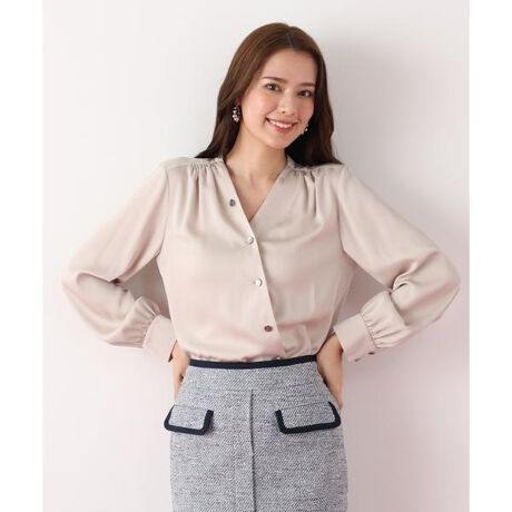 首元からのドレープが、胸元を華やかに見せるカシュクール仕立てなブラウス。程よく入った肩周りや袖のギャザーが女性らしいドレープを生み出してくれます。前立てのメタルコンビ貝釦が上品なデザインです。袖口のふんわりと広がった袖のチュールデザインが華やかなブラウス。