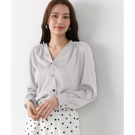 首元からのドレープが、胸元を華やかに見せるカシュクール仕立てなブラウス。程よく入った肩周りや袖のギャザーが女性らしいドレープを生み出してくれます。前立てのメタルコンビ貝釦が上品なデザインです。袖口のふんわりと広がった袖のチュールデザインが華やかなブラウス。