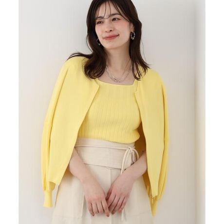 ハイゲージニットのライトブルゾン。薄手素材ですが、着るとシアー感はあまり出ないため、キレイ目にお召し頂けます。前を閉めても、鎖骨がキレイに見えるVネックです。セットインで肩回りはすっきりとさせ、肘上の切り替えにタックを入れて袖の下の方にボリュームを出しました。たっぷりとしたボリュームの袖を、リブの袖口でぎゅっとギャザーを寄せたデザインです。袖口を上げる位置で表情が変わり、袖を下ろしてすっきり見せても、上げてぱほっとさせても◎。袖のサイドにタックをとり、横からの見た目も可愛いです。長めのリブカフスと袖の切り替え位置で、腕を長く見せてくれる効果があります。