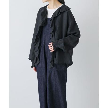 襟〜前立て・袖口に共布のフリルをたっぷりとあしらった主役ブラウス。天然素材ならではの抜けた雰囲気が程よく存在感を高めます。洗練されたカラー展開にも注目。カジュアルなパンツを合わせてスタイリングをお楽しみください。ジャケットの中からのぞかせると華やかさがプラスされ、オケージョンシーンでも着用いただけそうです。素材違いはシリーズアイテムからご覧ください。