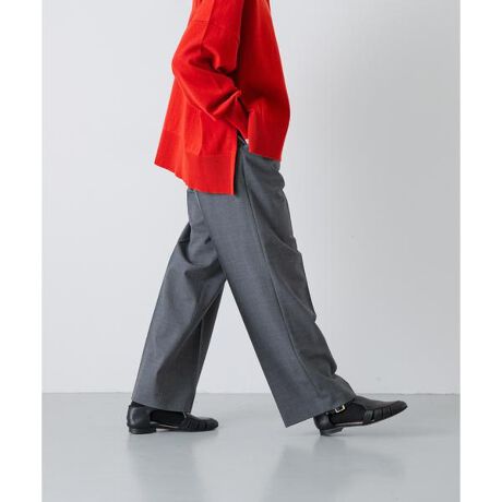 1本持っているとコーディネートの幅が広がるパンツをご紹介します。生地はサマーウール素材を使用したクリアな風合い。タックから続くセンタープレスが美しいシルエットを生んでいます。生地のストレッチ性とウエストに入ったゴムベルトが伸びて楽に着られるのも嬉しいポイント。かっちりとした印象ながらも着心地はストレスフリーな優秀アイテム。ループが付いているのでアクセントにベルトを通しても◎薄手で着やすくロングシーズン対応が可能です。肌寒い時にはレギンスを重ねていただくのがおすすめ。