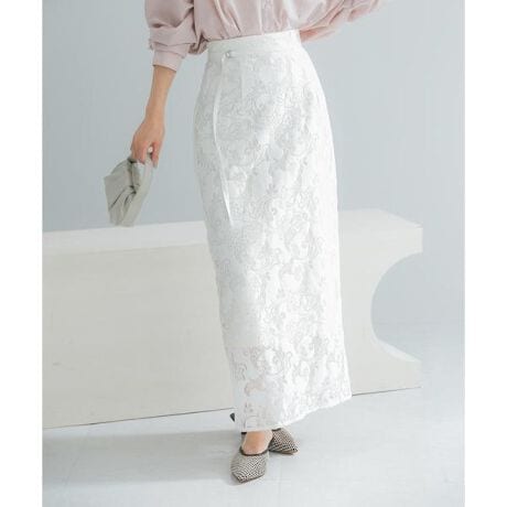 春夏らしい軽やかなシアー感が着こなしに上品で柔らかなニュアンスを添え、繊細なレース生地が織りなす程よい透け感により、カジュアルなスタイルもどこか都会的な印象に。高級感のある素材を活かしつつ、バックスリットを深めに施したストレートラインが美しいシルエットを描きます。 無地の別生地で作られたベルトデザインがウエストにシャープな余白を生み、腰まわりにすっきり感をプラス。 少し高めに設定されたウエスト位置が、スタイルアップを叶えながら凛とした大人の佇まいを演出してくれます。気になるヒップ周りは身体のラインを拾いすぎないサイジングにこだわり、安心感のある着心地を実現しました。 後ろウエストはゴム仕様になっているため、きれい見えしながらもリラックスして過ごせるのが魅力。 シンプルなカットソーをインしてスカートの柄を際立たせる、洗練された大人のデイリースタイルがおすすめ。