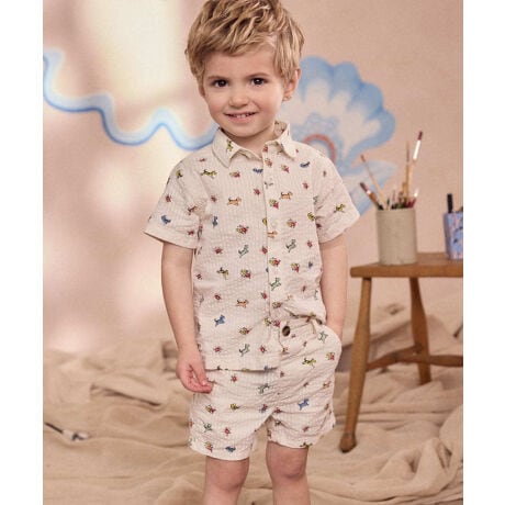 通気性の良いシアサッカーコットン生地で作られた、上下セット。クラシックな襟が付いたボタンダウンの半袖シャツに、ポケット付きのお揃いのショートパンツがセットになっています。カラフルな犬たちが遊びまわるBilly&Friendsプリント。