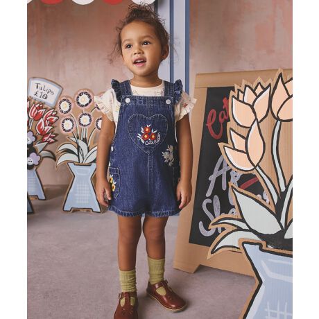 毎日の冒険をもっとスウィートに。動きやすさとCath Kidstonならではの繊細なディテールを兼ね備えた、チャーミングな2ピースセットです。インナーには、柔らかなButton Block FloralプリントのTシャツを。遊び心あふれるフリル袖がアクセントになり、一日中快適に過ごせる柔らかな肌触りが魅力です。コーディネートされたデニムのダンガリーショートパンツは、フリル付きのストラップと胸元のハート型ポケットが特徴。ポケットには、ブランドを象徴するロゴと花の刺繍が美しく施されています。<div>さらに、フロントやバックにも色とりどりの花の刺繍が散りばめられており、小さな探検家たちの時間を楽しく彩ってくれる、喜びいっぱいのセットアップです。<div>アーカイブから復活したこの花柄は、柔らかなクリーム色をベースに、色とりどりの花々が可憐に散りばめられています。さらに、手描き風のハートボタンの縁取りと、ブランドを象徴するピンクのロゴがアクセントになったユニークなデザインが魅力。