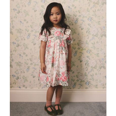 どんなシーンでも、どこか懐かしくチャーミングな華やかさを添えてくれるヴィンテージの薫り漂うフリルドレス。ふんわりとしたパフスリーブとボリュームのあるフルスカート、そして着脱しやすい背面のボタン仕様。可愛らしさはもちろん、お子様の動きやすさと実用性もしっかりと考え抜かれています。アーカイブ柄からインスパイアされたHackney Roseプリントは、ヴィンテージ感漂うエレガントなデザイン。ピンクやコーラルの花々がロマンティックに咲き誇り、繊細なレースのハート型パッチがアクセントを添えています。