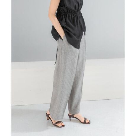 ナチュラルな質感のリネンにラメ糸を織り交ぜることで、今までにない新しい表情のパンツが完成。 初夏の陽光に映えるさりげない光沢が、日常の装いに知的な華やぎを添えてくれます。細めのベルトラインが、ボリューム感のあるワイドシルエットを美しく引き立てるデザインで、ハンサムで凛とした佇まいの中にラメの煌めきが洗練された女性らしさを醸し出します。 リネン特有の清涼感がありながらも、都会的でモダンな印象に仕上げたこだわりの一着です。同素材のジャケットを合わせたセットアップスタイルは、大人の余裕を感じさせる特別な装いに。 フリルネックのブラウスと合わせれば、甘さとシャープさが絶妙に調和した鮮度の高い着こなしが完成します。 足元はシンプルなサンダルを選び、パンツの素材感を主役にするスタイリングがおすすめです。