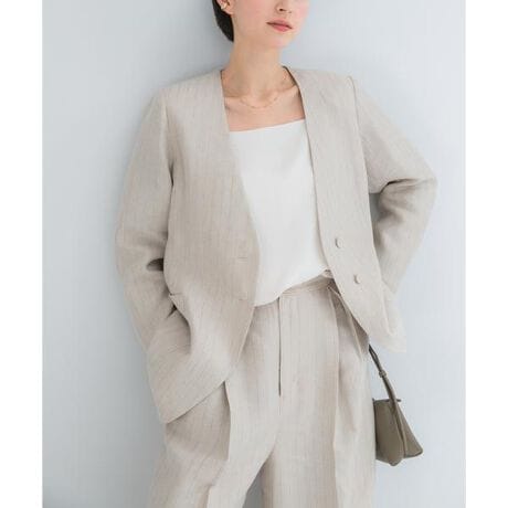 清涼感のあるリネン素材にさりげないきらめきを掛け合わせることで、初夏の陽光に映える洗練された一着に仕上げました。 カジュアルな質感の中に宿るほのかな光沢が、大人の日常に新しい刺激を運んでくれます。装飾を削ぎ落としたミニマルなノーカラーデザインが、顔まわりにすっきりとした抜け感を演出。 共布のくるみボタンを添えることで、ヴィンテージライクな温かみのあるアクセントをプラスしました。 カーディガン感覚でさらりと羽織れる軽やかさがありながら、ジャケットらしいきちんと感も備えています。同素材のパンツを合わせたセットアップスタイルなら、ワンランク上の洗練された佇まいが完成。 シンプルなワンピースの上に肩掛けしたり、デニムと合わせて素材のコントラストを楽しむ着こなしもおすすめです。柔らかな印象を纏うベージュと、都会的でスタイリッシュなチャコールの2色展開。