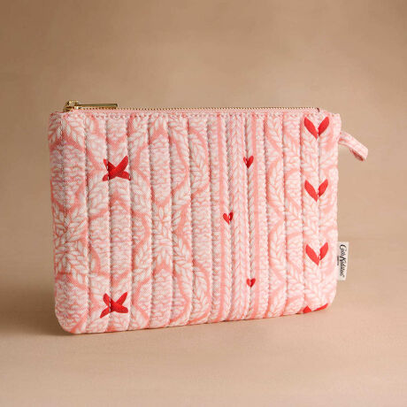ふっくらとしたキルトコットン素材で、毎日持ち歩きたくなる可愛らしさ。ジッパー付きで安心。バッグに簡単に取り付けられるフックが付いています。心地よいニットデザインを模した、遊び心のある繊細な模様。ハートとステッチのデザインが、美しくノスタルジックな雰囲気を醸し出します。
