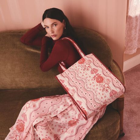 ふんわりと心地よいキルティング素材が、プリントの美しさを引き立てます。このプリントは、かつてロンドンのイーストエンドで栄えたシルク織物産業への敬意を込め、細部まで愛情を込めて手描きされたもの。温かみのあるピンクのトーンの中に、エレガントな花のモチーフ、リボンやデコラティブ縁取りが描かれています。