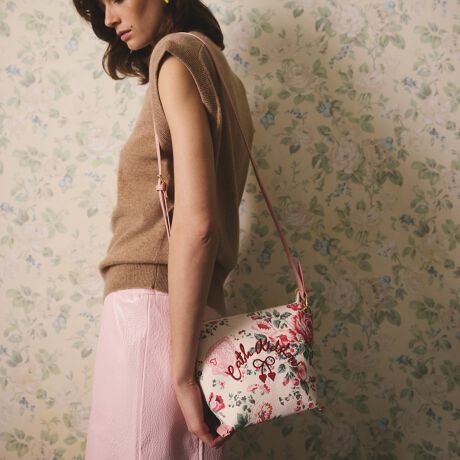 デイリーユースに最適なクロスボディバッグ。スタイリッシュさと機能性を兼ね備えた、ユニークな台形シルエットが特徴です。ショルダーストラップを外せばポーチとしても使える2WAY仕様。日中のカジュアルなスタイルから、夜の少し改まったシーンまで、幅広く活躍する万能アイテムです。アーカイブ柄からインスパイアされたHackney Roseプリントは、ヴィンテージ感漂うエレガントなデザイン。ピンクやコーラルの花々がロマンティックに咲き誇り、繊細なレースのハート型パッチがアクセントを添えています。