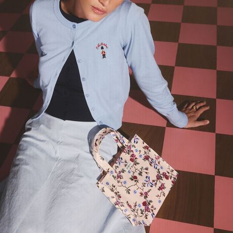 Cath Kidstonで人気のブックバッグの使いやすいスモールサイズ。特徴的なシルエットはそのままに、より小さく便利なサイズです。コーティングされた光沢のあるコットンは拭くことができ、お手入れも簡単です。【Acorn Sprig】枝に咲き誇るローズと煌めくジュエルが水彩画の繊細なタッチで描かれています。