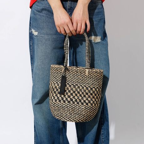 かごのナチュラルな雰囲気とモノトーンの柄がモダンで大人っぽい印象です。