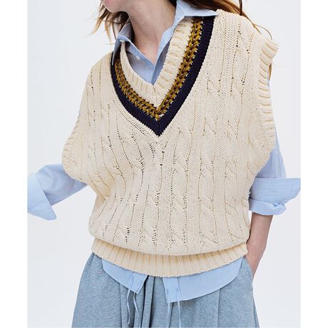 ・コットンリネンの糸でざっくりと編み上げた、ナチュラルな風合いと清涼感が魅力のケーブルニットベスト。
