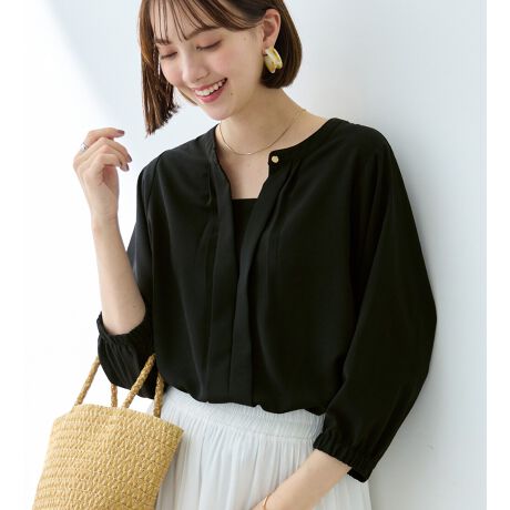 ・胸元はレイヤード風デザインで、少しラフな抜け感を演出。ボタンを閉めればきちんとした印象も与えます。