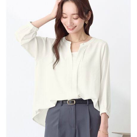 ・胸元はレイヤード風デザインで、少しラフな抜け感を演出。ボタンを閉めればきちんとした印象も与えます。