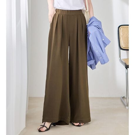 ・脚のラインを拾わないワイドシルエットでも、とろみ素材の落ち感で着膨れせず痩せ見えが叶う。