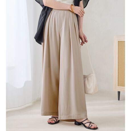 ・脚のラインを拾わないワイドシルエットでも、とろみ素材の落ち感で着膨れせず痩せ見えが叶う。