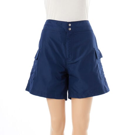 ポリエステルリップストップという強度の高い糸が織り込まれていて、ほつれにくく破れにくい避けても途中で止まる特徴がある生地を使用。前ファスナーあきでウエストはバックゴム仕様。着脱も楽で動きやすく、裾が広めのシルエットで太ももが細く見える効果が期待できます。マジックテープついたの蓋つきポケットで中のものが飛び出す心配もありません。ウエストはインスピンドルでサイズ調節可能。ポケットは水に入っても大丈夫な水抜き穴つき。スイムレギンスと合わせて水に入っても大丈夫。