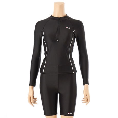 シンプルな長袖ラッシュの水着セット。スタンドカラーのラッシュ首元はハーフジップ開き。脇に3mmのカラーラインが入っています。胸にFILAのロゴプリント。胸裏部分は挿入式のカップが付いていて、お好きなカップに入れ替えも可能です。パンツ前部分全体にも胸部分と同じ伸びの良い裏地をつけています。トップスがめくれ上がりにくい仕様です。ウエストは内側の紐で調節できます。