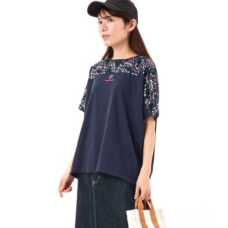やさしい風合いが特徴のメッシュ生地を本体に使用したUVTシャツです。ショルダー部分のリーフプリント生地切り替えがデザインポイントです。ゆったりしたシルエットで、素材はポリエステル100%ですが編み地にストレッチ性がありスポーツにも最適です。体型カバーもバッチリです。胸に角Fのグラフィックロゴいりです。