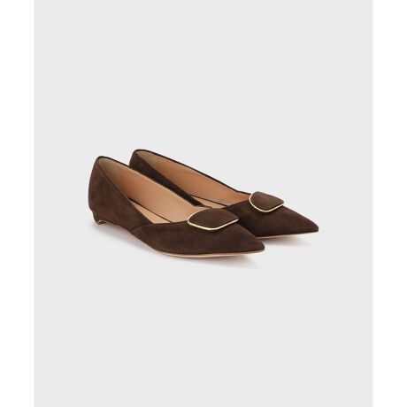 上質なやぎ革で作られた、タイムレスに愛される大人なバックルシューズ。フラット感覚で履ける楽なローヒールでありながら、スマートなポインテッドトゥのお陰ですらっと美脚見えする一足。アッパーにはゴールドでトリミングされた大きなモチーフが添えられ、より一層高級感に溢れます。