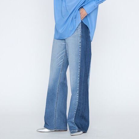 太く見えがちなワイドデニムを独自のディテールと立体パターンで、細見えが期待できる中空ストレッチデニム サイドラインワイドジーンズです。