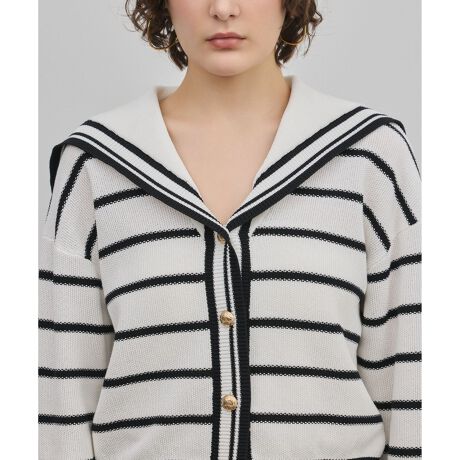[型番:0326143367]綿混素材。セーラーカラーのニットカーディガン。表面感のあるカノコ編みボーダー。※こちらのモデル着用画像はサンプル品を撮影しております。実際の商品と仕様、加工、サイズが若干異なる場合がございます。予めご了承くださいませ。