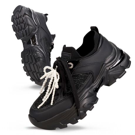 パールのリボンチャームが目を引く、華やかなデザインのスニーカー。チャームは取り外し可能な2way仕様で、気分やコーディネートに合わせたアレンジが楽しめる。切替部分にはグリッターライン、シューレースホールにはビジューをあしらい、細部までこだわった1足。カジュアルになりすぎないので、デイリー使いからきれいめコーデにもぴったりな、フェミニンムード高まるスニーカー。サンプルにて撮影をしておりますので、中敷色、ロゴ色、裏地の色の仕様に変更がある場合がございます。あらかじめご了承ください。