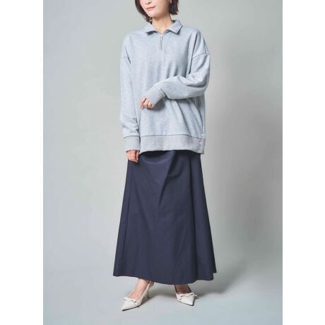 スウェットでカジュアルになりすぎないようスカート合わせがオススメ。