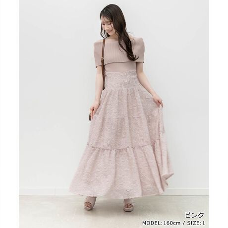 リブ編みニットのフィット感と、フリンジが揺れるスカートの軽やかさとのコントラストが、女性らしいムードを引き立ててくれます。