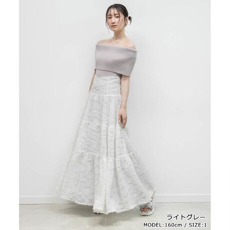 リブ編みニットのフィット感と、フリンジが揺れるスカートの軽やかさとのコントラストが、女性らしいムードを引き立ててくれます。