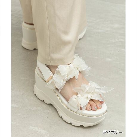 シアーリボンをたっぷりとあしらい、カジュアルなスポサンをフェミニンに仕上げたRANDAらしい一足です。