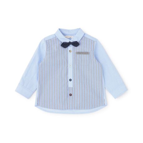 つけ外し可能な蝶ネクタイがセットになっているシャツです。カラフルなボタンと前身頃のストライプがおしゃれなポイント。きちんと感のあるデザインなので、カジュアルコーデやきれいめのスタイリングにマッチします。内側にお名前を記入できるタグつき。
