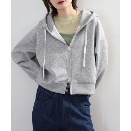 パーカーの下に薄手のリブタンクを重ね、ボトムにはハイウエストのフレアスカートを合わせると、コンパクト丈がウエスト位置を高く見せて自然なスタイルアップに。
