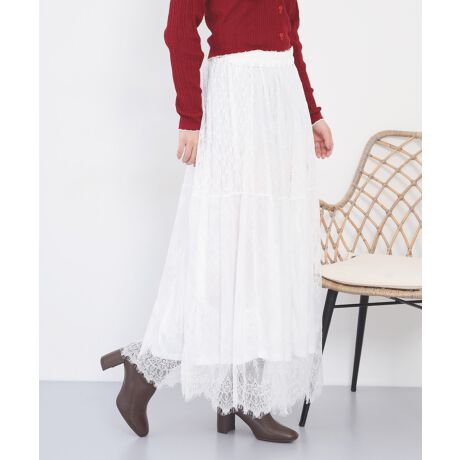 繊細なひげレースを贅沢に切り替えたロングスカートで、動くたびにふわりと揺れる軽やかさが魅力。