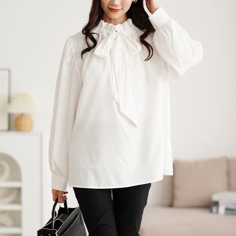 首元のリボンタイがポイントの、フェミニンムードたっぷりなブラウス。絞り具合でフリル感や開き具合を調整でき、その日の気分で印象チェンジが楽しめます。パンツにもスカートにも合わせやすく、オンオフ問わず活躍します。