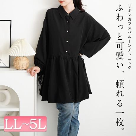【大きいサイズ】 リボンカフスバルーンペプラムチュニック 大きいサイズ レディース チュニック