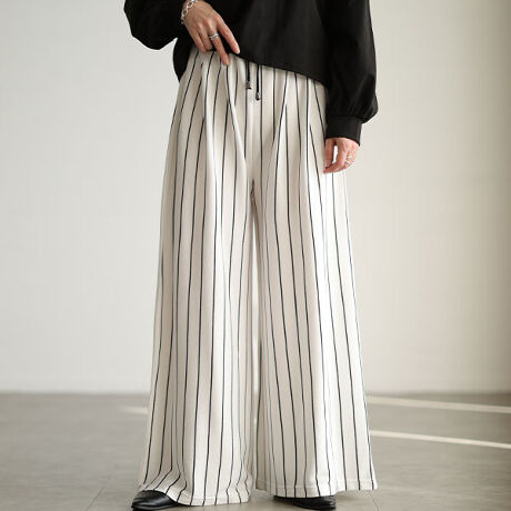 細めのストライプ柄で仕立てられたワイドパンツは、コーデに投入するだけでスタイリッシュ感を纏う都会的ハンサムなスタイリングに。トレンド感のあるワイドパンツと廃りの無いデザインが、綺麗めにもカジュアルにも、さらにはモードスタイルにも馴染む万能な一本。ワイド幅レッグだから下半身を拾うことなく、穿くだけで体型カバー。ストライプ柄とロング丈で縦ラインを強調し、すっきり&脚長効果抜群。ウエストゴムとドロスト仕様でお好みのフィット感に調節可能で安心。ウエスト部分にタック入りだから腰回りをすっきりさせてくれます。