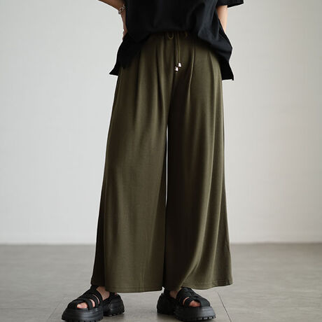 たっぷりのワイド幅レッグがハンサムな印象漂うロングパンツを、綺麗めカジュアルに落とし込んだリラックススタイルが完成。ドレープを纏う柔らかな風合いある生地で、表情のあるシルエットに。フレア感を感じさせるワイド幅で、華やかさもプラスします。ウエストには総ゴム&ドロスト仕様で、お好みのフィット感に調節可能なうえ、安心感も。ウエスト部分にタックを仕込むことで、腰回りをすっきりさせつつ、綺麗めな印象に。たっぷりのワイド幅とフレア感のあるロング丈で、下半身の縦ラインを強調しすっきり見え。