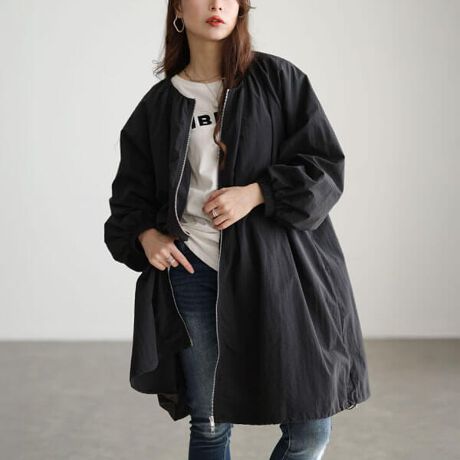 絶対的主役感☆撥水ギャザー裾ドロストロングブルゾン首元ギャザーからふわりと広がるゆったりシルエットで大きめバストの方も◎膝にかかる着丈とフレアシルエットでボディラインをふわっとカバー♪裾ドロスト・Wファスナーをコーデに合わせて調整するだけでお洒落な着こなしに◎多様なコーデに合わせやすいシンプルデザインで春〜秋大活躍☆撥水機能付きで梅雨時期にも♪
