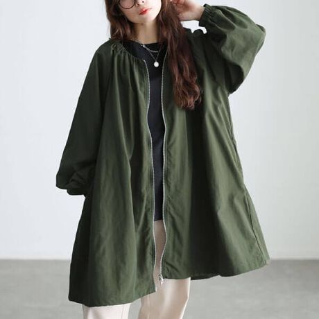 絶対的主役感☆撥水ギャザー裾ドロストロングブルゾン首元ギャザーからふわりと広がるゆったりシルエットで大きめバストの方も◎膝にかかる着丈とフレアシルエットでボディラインをふわっとカバー♪裾ドロスト・Wファスナーをコーデに合わせて調整するだけでお洒落な着こなしに◎多様なコーデに合わせやすいシンプルデザインで春〜秋大活躍☆撥水機能付きで梅雨時期にも♪