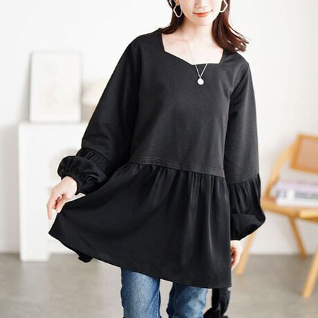 オトナ可愛く体型カバー☆ヴィラーゴスリーブ異素材チュニックふわっと広がるペプラムシルエットでぽっこりお腹&ヒップライン気にならない♪人気上昇中のヴィラーゴスリーブで手軽にトレンド&こなれ感のあるカジュアルコーデが完成★気軽に着れるシンプルデザインで日常〜お出かけまで多様なシーンで大活躍◎