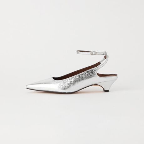 シャープなシルエットのポンテッドトゥに、バックストラップとアンクルストラップがクロスしたフェミニンなデザインのパンプスです。