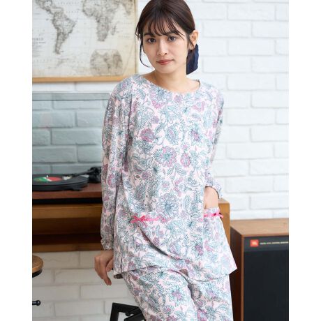 優しい色使いの花柄が上品な印象をあたえる、チュニックタイプのリラックスパジャマです。