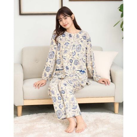 優しい色使いの花柄が上品な印象をあたえる、チュニックタイプのリラックスパジャマです。