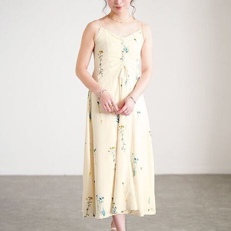 上半身を引き締めるバックシャーリングで簡単スタイルアップ、キャミソールワンピース。淡い色合いの優しいボタニカル柄がナチュラルな印象。胸元にも引き紐があり、バスト周りを調整でき、身体のラインにしっかりフィット。ウエストから広がるフレアシルエットが、歩くたびにエレガント。裏地付きのワンピースで、透け感も気にせず安心。さらっとした肌触りの生地で、素肌にも優しい一枚。デートやお呼ばれ、お出かけなどにぴったり、気分を華やげてくれるアイテムです。