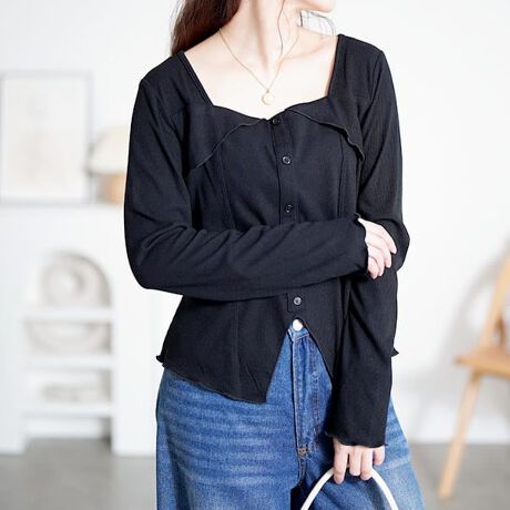 オシャレ度高め、日常に取り入れやすいスクエアネックカットソー。広めに開いたスクエアネックがデコルテラインをきれい見せ。顔まわりに自然な抜け感をつくり、すっきり見せが完成。斜めに重なった生地デザインがシンプルながらも印象に残るディテール。リブ素材の縦ラインと適度なフィット感で上半身をすっきり見せ。裾前側の逆V字カットが腰まわりに軽やかな動きをプラスします。オフィスカジュアルからデート、デイリーやお出かけまで幅広く対応。きれいめとガーリーをバランスよく楽しみたい方におすすめです。